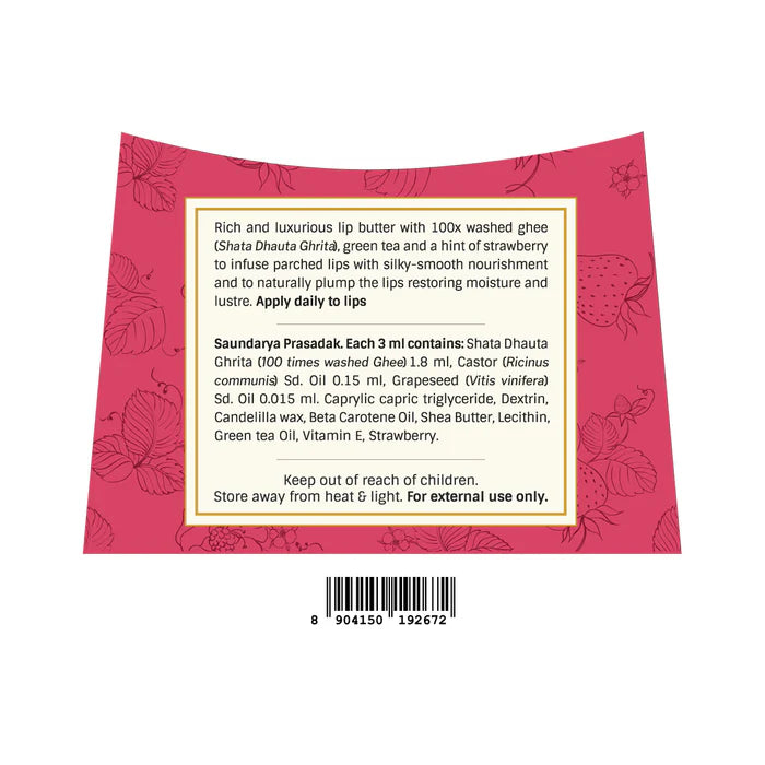 Shata Dhauta Ghrita (100 times washed Ghee), Castor (Ricinus communis) Sd. Oil, Grapeseed (Vitis vinifera ) Sd. Oil. Caprylic capric triglyceride, Dextrin, Candelilla wax, Beta Carotene Oil, Shea Butter, Lecithin, Green tea Oil, Vitamin E, Strawberry.